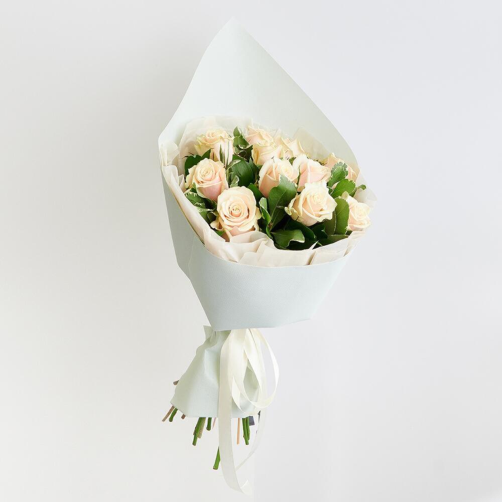 розы талея - 11 шт. Зелень - 5 шт. Открыточка с вашими пожеланиями - 1 шт. Упаковка дизайнерская - 2 шт.